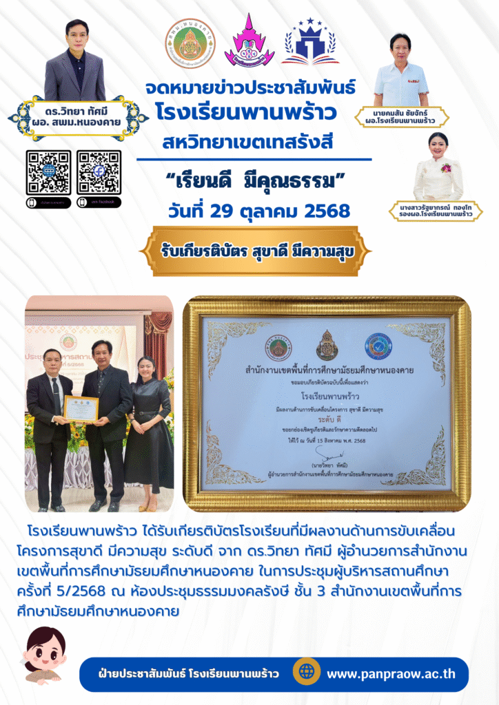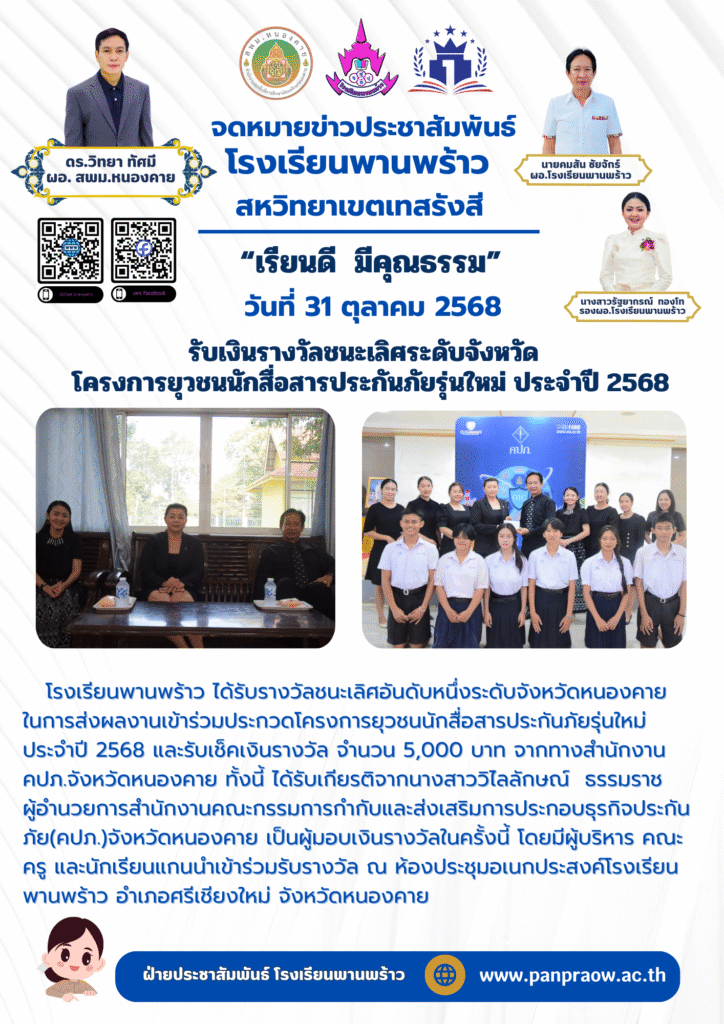 รับเงินรางวัลชนะเลิศระดับจังหวัด โครงการยุวชนนักสื่อสารประกันภัยรุ่นใหม่ ประจำปี 2568